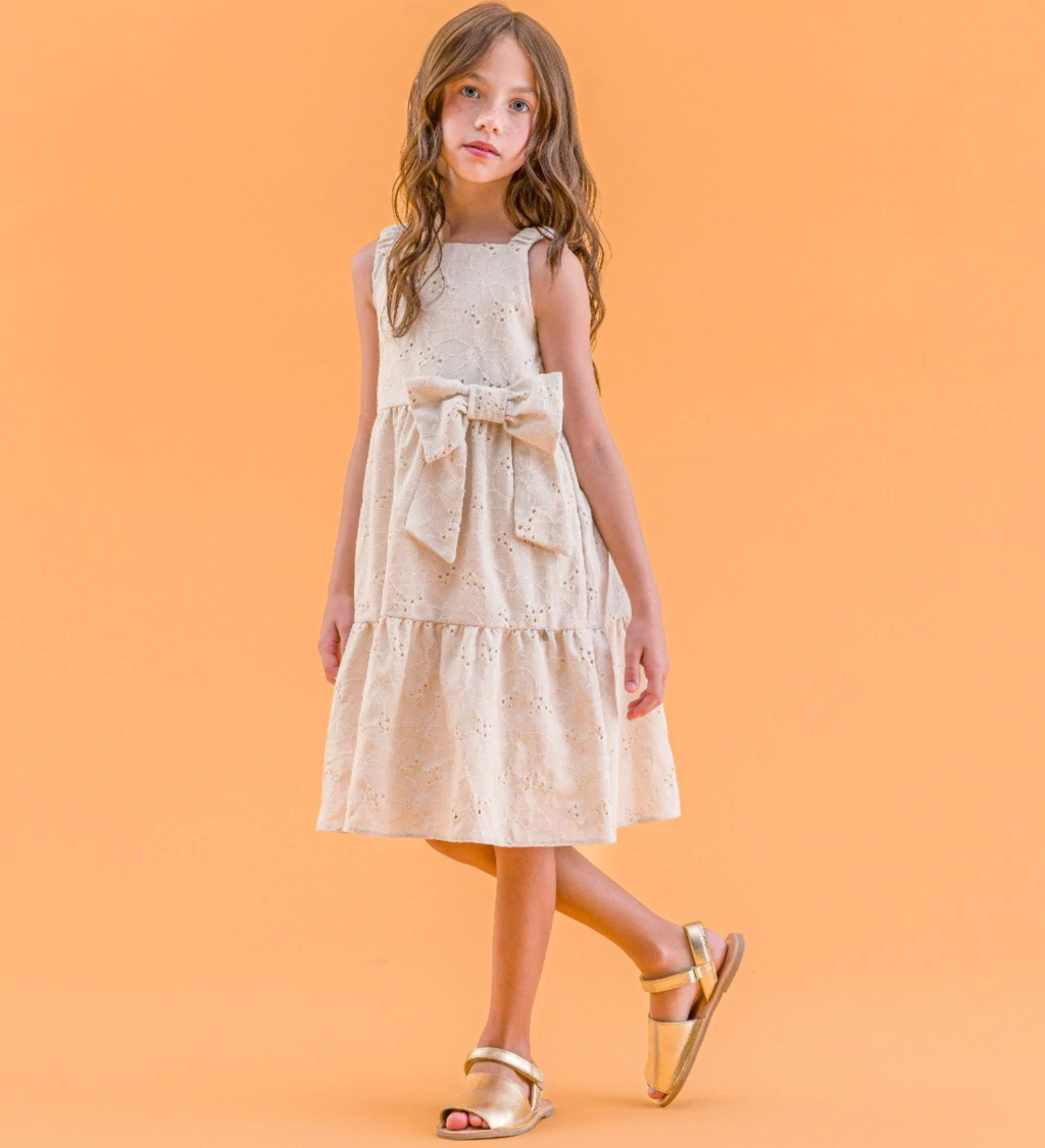 Vestido em laise na cor cru, confeccionado em poliéster, viscose e linho, que garante conforto, leveza e um toque sofisticado ao look. Possui alças com elástico, formando um delicado detalhe drapeado, e leve elástico nas costas para melhor ajuste ao corpo. A parte de baixo é levemente rodada com babado na barra, conferindo movimento e delicadeza. O destaque especial fica por conta do lindo laço na lateral frontal, que traz sofisticação, estilo e um charme extra ao look. Finalizando, a peça conta com uma plaquinha em formato de coração com o nome da marca, um detalhe exclusivo.